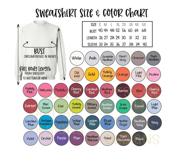 Relaxed, unisex Gildan crew sweatshirt will come as pictured. If you would like to change the color, please leave a note at check out.